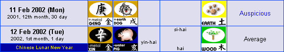 i.e. 1 Feb 2002 (Fri) - 2002, 12th month, 20 day geng-zi, with no combinations, shu-chou clash, Water element - Inauspicious