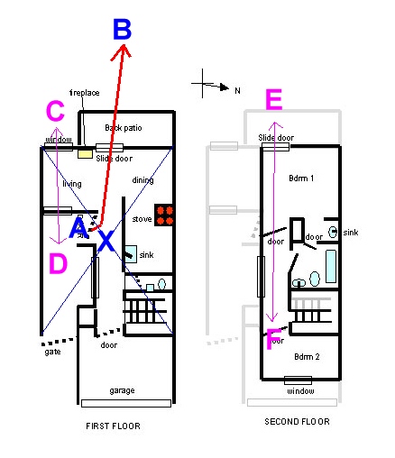 The entrance into the house is close to the centrepoint of the house at Marking X. There is compressed qi (narrowing) at this area. Upstairs also has similar compressed Qi at markings E and F.