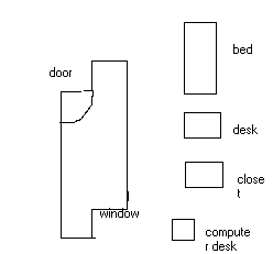 I am a student living in a university dorm and i have difficulty in arraging my furnitures according to feng shui, given such a small space. I have to fit a bed, computer table, study desk, a wardrobe and two shelves into a rectangular-like tiny room! Here's an illustration, with the opening as the entrance (upper left) and the lower right as the window (the only!). Ignore the dots.