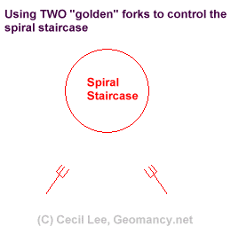 Note: the fork (metal) is used to control the spiral staircase and not to `destroy' it i.e. for those who look at the Destructive Cycle (ref: https://www.geomancy.net/resources/theories/fs-5element.htm ) Fire is the element that destroys metal. But, do not paint the spoon red in this case.